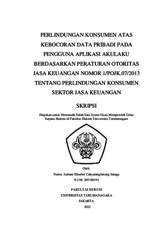 Sinaga, Adriani Elisabet Cahyaninglintang (2022) Perlindungan Data Pribadi Konsumen Atas Kebocoran Data Pribadi Pada Pengguna Aplikasi Akulaku Berdasarkan Peraturan Otoritas Jasa Keungan Nomor 1/POJK.07/2013 Tentang Perlindungan Konsumen Sektor Jasa Keuangan. Skripsi thesis, Universitas Tarumanagara.