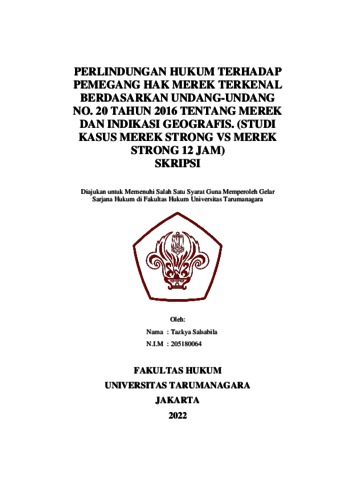 Salsabila, Tazkya (2022) Perlindungan Hukum Terhadap Pemegang Hak Merek Terkenal Berdasarkan Undang-Undang No. 20 Tahun 2016 Tentang Merek Dan Indikasi Geografis. (Studi Kasus Merek Strong vs Merek Strong 12 Jam). Skripsi thesis, Universitas Tarumanagara.
