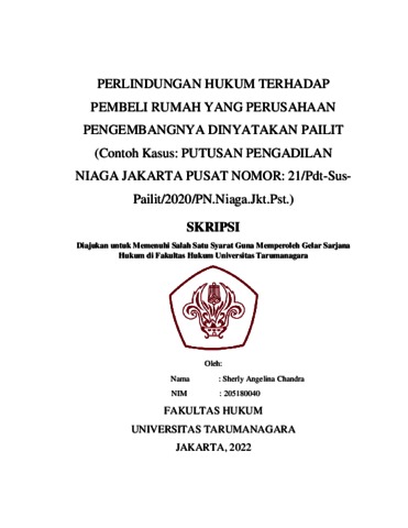 Chandra, Sherly Angelina (2022) PERLINDUNGAN HUKUM TERHADAP PEMBELI RUMAH YANG PERUSAHAAN PENGEMBANGNYA DINYATAKAN PAILIT (Contoh Kasus: PUTUSAN PENGADILAN NIAGA JAKARTA PUSAT NOMOR: 21/Pdt-Sus-Pailit/2020/PN.Niaga.Jkt.Pst.). Skripsi thesis, Universitas Tarumanagara.