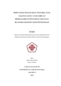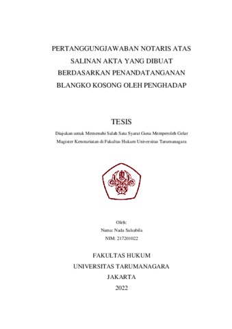 Salsabila, Nada (2022) Pertanggungjawaban Notaris atas Salinan Akta yang Dibuat Berdasarkan Penandatanganan Blangko Kosong oleh Penghadap. Masters thesis, Universitas Tarumanagara.