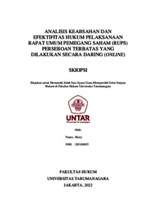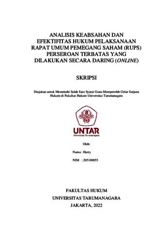 Harry, Harry (2022) Analisis Keabsahan dan Efektifitas Hukum Pelaksanaan Rapat Umum Pemegang Saham (RUPS) Perseroan Terbatas yang Dilakukan Secara Daring (Online). Skripsi thesis, Universitas Tarumanagara.