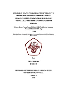 Chandra, Diki (2022) Kedudukan Status Perkawinan Tidak Tercatat Di Direktorat Jenderal Kependudukan Dan Pencatatan Sipil Terhadap Hak Waris Anak Berdasarkan Kitab Undang-Undang Hukum Perdata. Masters thesis, Universitas Tarumanagara.