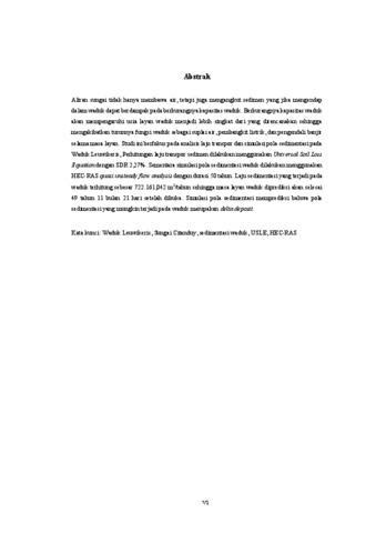Aliran sungai tidak hanya membawa air, tetapi juga mengangkut sedimen yang jika mengendap dalam waduk dapat berdampak pada berkurangnya kapasitas waduk. Berkurangnya kapasitas waduk akan mempengaruhi usia layan waduk menjadi lebih singkat dari yang direncanakan sehingga mengakibatkan turunnya fungsi waduk sebagai suplai air, pembangkit listrik, dan pengendali banjir selama masa layan. Studi ini berfokus pada analisis laju transpor dan simulasi pola sedimentasi pada Waduk Leuwikeris, Perhitungan laju transpor sedimen dilakukan menggunakan Universal Soil Loss Equation dengan SDR 2,27%. Sementara simulasi pola sedimentasi waduk dilakukan menggunakan HEC-RAS quasi unsteady flow analysis dengan durasi 50 tahun. Laju sedimentasi yang terjadi pada waduk terhitung sebesar 722.161,042 m3/tahun sehingga masa layan waduk diprediksi akan selesai 49 tahun 11 bulan 21 hari setelah dibuka. Simulasi pola sedimentasi memprediksi bahwa pola sedimentasi yang mungkin terjadi pada waduk merupakan delta deposit. Kata kunci: Waduk Leuwikeris, Sungai Citanduy, sedimentasi waduk, USLE, HEC-RAS