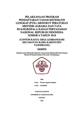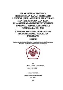 Ningrum, Wiranti Agustina (2022) Pelaksanaan Program Pendaftaran Tanah Sistematis Lengkap (PTSL) Menurut Peraturan Menteri Agraria dan Tata Ruang/Kepala Badan Pertanahan Nasional Republik Indonesia Nomor 6 Tahun 2018 (Contoh Kasus: Desa Lembangsari Kecamatan Rajeg KabupatenTangerang). Skripsi thesis, Universitas Tarumanagara.