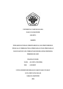 Chandra, Juanita (2017) PENGARUH LEVERAGE, PROFITABILITAS, DAN PERTUMBUHAN PENJUALAN TERHADAP NILAI PERUSAHAAN PADA PERUSAHAAN MANUFAKTUR YANG TERDAFTAR DI BURSA EFEK INDONESIA PERIODE 2011-2015. Skripsi thesis, UNIVERSITAS TARUMANAGARA.