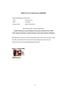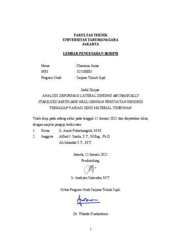 Aziza, Charisma (2022) Analisis deformasi lateral dinding mechanically stabilized earth (mse wall) dengan perkuatan geogrid terhadap variasi jenis material timbunan. Skripsi thesis, Universitas Tarumanagara.