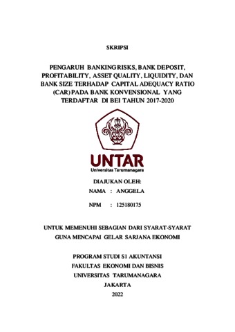ANGGELA, ANGGELA (2021) PENGARUH BANKING RISKS, BANK DEPOSIT, PROFITABILITY, ASSET QUALITY, LIQUIDITY, DAN BANK SIZE TERHADAP CAPITAL ADEQUACY RATIO (CAR) PADA BANK KONVENSIONAL YANG TERDAFTAR DI BEI TAHUN 2017-2020. Skripsi thesis, Universitas Tarumanagara.