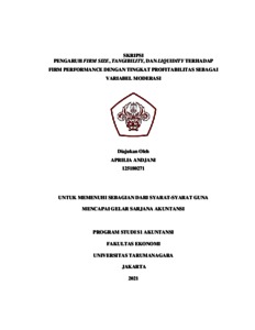 ANDJANI, APRILIA (2021) PENGARUH FIRM SIZE, TANGIBILITY, DAN LIQUIDITY TERHADAP FIRM PERFORMANCE DENGAN TINGKAT PROFITABILITAS SEBAGAI VARIABEL MODERASI. Skripsi thesis, Universitas Tarumanagara.