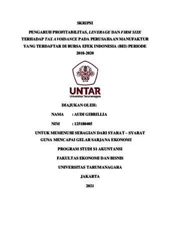 GIBRILLIA, AUDI (2021) PENGARUH PROFITABILITAS, LEVERAGE DAN FIRM SIZE TERHADAP TAX AVOIDANCE PADA PERUSAHAAN MANUFAKTUR YANG TERDAFTAR DI BURSA EFEK INDONESIA (BEI) PERIODE 2018-2020. Skripsi thesis, Universitas Tarumanagara.