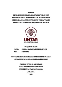 HARYANI, BELLA NATASYA PUTRI (2021) PENGARUH LEVERAGE, PROFITABILITY, DAN NET WORKING CAPITAL TERHADAP CASH HOLDING PADA PERUSAHAAN MANUFAKTUR YANG TERDAFTAR DI BURSA EFEK INDONESIA (BEI) PERIODE 2018-2020. Skripsi thesis, Universitas Tarumanagara.