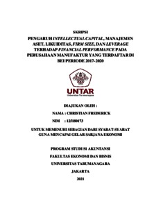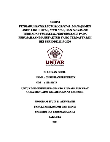 FREDERICK, CHRISTIAN (2021) PENGARUH INTELLECTUAL CAPITAL, MANAJEMEN ASET, LIKUIDITAS, FIRM SIZE, DAN LEVERAGE TERHADAP FINANCIAL PERFORMANCE PADA PERUSAHAAN MANUFAKTUR YANG TERDAFTAR DI BEI PERIODE 2017-2020. Skripsi thesis, Universitas Tarumanagara.