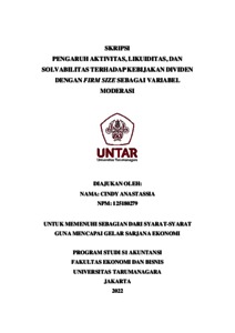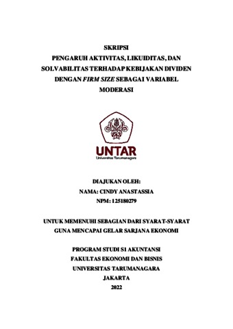 ANASTASSIA, CINDY (2021) PENGARUH AKTIVITAS, LIKUIDITAS, DAN SOLVABILITAS TERHADAP KEBIJAKAN DIVIDEN DENGAN FIRM SIZE SEBAGAI VARIABEL MODERASI. Skripsi thesis, Universitas Tarumanagara.
