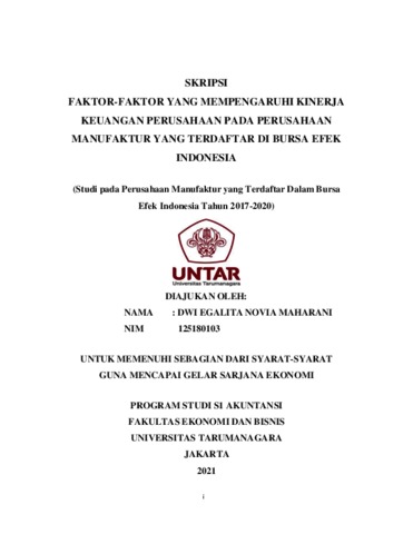 MAHARANI, DWI EGALITA NOVIA (2021) FAKTOR-FAKTOR YANG MEMPENGARUHI KINERJA KEUANGAN PERUSAHAAN PADA PERUSAHAAN MANUFAKTUR YANG TERDAFTAR DI BURSA EFEK INDONESIA (Studi pada Perusahaan Manufaktur yang Terdaftar Dalam Bursa Efek Indonesia Tahun 2017-2020). Skripsi thesis, Universitas Tarumanagara.