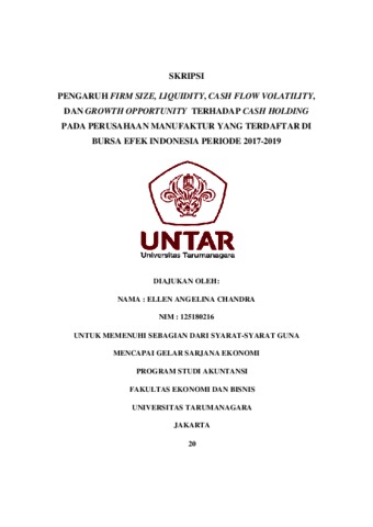 CHANDRA, ELLEN ANGELINA (2021) PENGARUH FIRM SIZE, LIQUIDITY, CASH FLOW VOLATILITY, DAN GROWTH OPPORTUNITY TERHADAP CASH HOLDING PADA PERUSAHAAN MANUFAKTUR YANG TERDAFTAR DI BURSA EFEK INDONESIA PERIODE 2017-2019. Skripsi thesis, Universitas Tarumanagara.