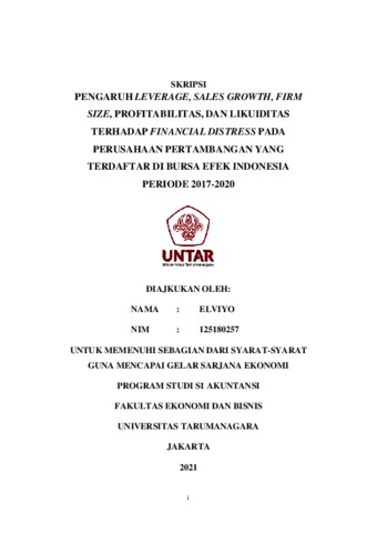 ELVIYO, ELVIYO (2021) PENGARUH LEVERAGE, SALES GROWTH, FIRM SIZE, PROFITABILITAS, DAN LIKUIDITAS TERHADAP FINANCIAL DISTRESS PADA PERUSAHAAN PERTAMBANGAN YANG TERDAFTAR DI BURSA EFEK INDONESIA PERIODE 2017-2020. Skripsi thesis, Universitas Tarumanagara.