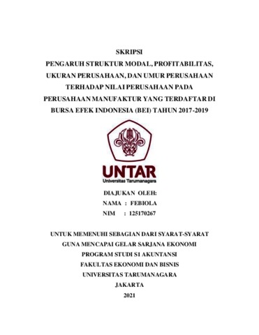 FEBIOLA, FEBIOLA (2021) PENGARUH STRUKTUR MODAL, PROFITABILITAS, UKURAN PERUSAHAAN, DAN UMUR PERUSAHAAN TERHADAP NILAI PERUSAHAAN PADA PERUSAHAAN MANUFAKTUR YANG TERDAFTAR DI BURSA EFEK INDONESIA (BEI) TAHUN 2017-2019. Skripsi thesis, Universitas Tarumanagara.