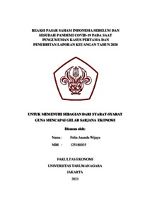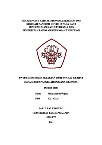 Wijaya, Felia Ananda (2021) REAKSI PASAR SAHAM INDONESIA SEBELUM DAN SESUDAH PANDEMI COVID-19 PADA SAAT PENGUMUMAN KASUS PERTAMA DAN PENERBITAN LAPORAN KEUANGAN TAHUN 2020. Skripsi thesis, Universitas Tarumanagara.