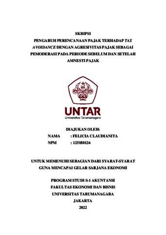 CLAUDIANITA, FELICIA (2021) PENGARUH PERENCANAAN PAJAK TERHADAP TAX AVOIDANCE DENGAN AGRESIVITAS PAJAK SEBAGAI PEMODERASI PADA PERIODE SEBELUM DAN SETELAH AMNESTI PAJAK. Skripsi thesis, Universitas Tarumanagara.