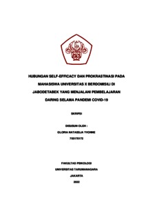 Yvonne, Natassja Gloria (2022) Hubungan Self-efficacy dan Prokrastinasi pada Mahasiswa Universitas X berdomisili di JABODETABEK yang Menjalani Pembelajaran Daring Selama Pandemi COVID-19. Skripsi thesis, Universitas Tarumanagara.