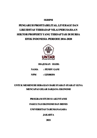 GANI, FENDY (2021) PENGARUH PROFITABILITAS, LEVERAGE DAN LIKUIDITAS TERHADAP NILAI PERUSAHAAN SEKTOR PROPERTI YANG TERDAFTAR DI BURSA EFEK INDONESIA PERIODE 2016-2020. Skripsi thesis, Universitas Tarumanagara.