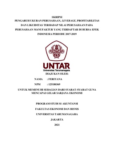 FERIYANA, FERIYANA (2021) PENGARUH UKURAN PERUSAHAAN, LEVERAGE, PROFITABILITAS DAN LIKUIDITAS TERHADAP NILAI PERUSAHAAN PADA PERUSAHAAN MANUFAKTUR YANG TERDAFTAR DI BURSA EFEK INDONESIA PERIODE 2017-2019. Skripsi thesis, Universitas Tarumanagara.
