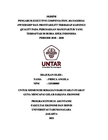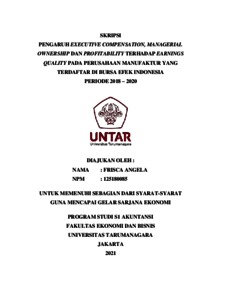 ANGELA, FRISCA (2021) PENGARUH EXECUTIVE COMPENSATION, MANAGERIAL OWNERSHIP DAN PROFITABILITY TERHADAP EARNINGS QUALITY PADA PERUSAHAAN MANUFAKTUR YANG TERDAFTAR DI BURSA EFEK INDONESIA PERIODE 2018 – 2020. Skripsi thesis, Universitas Tarumanagara.