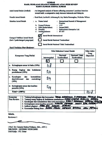 Keni Keni, Review (2022) Review An integrated analysis of factors affecting consumers' purchase intention toward batik: a comparative study between Indonesia and Malaysia. An integrated analysis of factors affecting consumers' purchase intention toward batik: a comparative study between Indonesia and Malaysia, 15 (1). pp. 87-107. ISSN 1477-9064 / 1741-8143