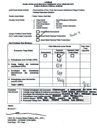 Keni Keni, Review (2021) Review Perceived Ease of Use, Trust, dan Customer Satisfaction sebagai Prediktor terhadap Repurchase Intention. Perceived Ease of Use, Trust, dan Customer Satisfaction sebagai Prediktor terhadap Repurchase Intention, 20 (2). pp. 107-118. ISSN 1411-9293 / 2579-4094