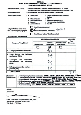 Keni Keni, Review (2021) Review The Role of Perceived Usefulness and Perceived Ease of Use Toward Satisfaction and Trust which Influence Computer Consumers' Loyalty in China. The Role of Perceived Usefulness and Perceived Ease of Use Toward Satisfaction and Trust which Influence Computer Consumers' Loyalty in China, 23 (2). pp. 262-294. ISSN 1411-1128 / 2338-7238