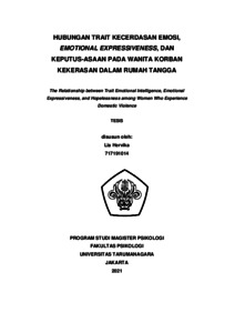 Hervika, Lia (2022) Hubungan Trait Kecerdasan Emosi, Emotional Expressiveness, dan Keputusasaan pada Wanita Korban Kekerasan Dalam Rumah Tangga. Masters thesis, Universitas Tarumanagara.