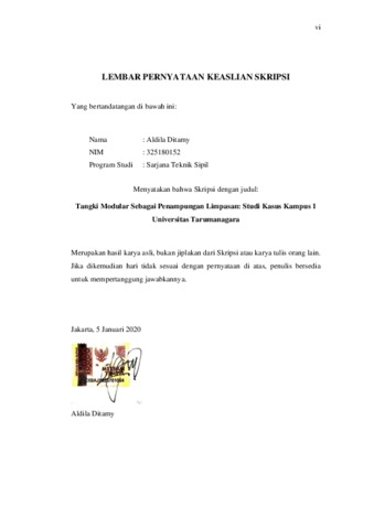 Air tawar merupakan sumber air baku untuk kehidupan sehari -hari, namun jumlahnya sangat sedikit dibandingkan dengan air laut dan utamanya hanya bersumber dari air hujan. Meski begitu hujan yang tidak ditangani dengan baik akan berakibat banjir. Mengambil ide pemanenan air hujan dengan penyimpanan air bawah tanah menggunakan tangki modular, tangki pen yimpanan air dibuat dengan metode yang sama tetapi untuk mengumpulkan limpasan air hujan. Hasil penelitian akhir adalah perencanaan tangki modular dibangun di taman/titik kumpul Kampus 1 Universitas Tarumanagara sebesar 1 4 m x 8 m x 0,45 m. Kotak filter inlet direncanakan berukuran 0,4 m x 0,4 m x 0,19 m dengan saringan berbentuk silinder berdiameter 0,3 m dengan tinggi 0,1 m. Pengaruh air tampungan terhadap penggunaan air Kampus 1 Universitas Tarumanagara bersifat fluktuatif setiap bulannya dengan rata -rata pengaruh 14,59%. Pengecekan uplift pada saat tangki kosong adalah 0,517 >1,25 dan pada saat terisi adalah 0,787>1,25, sehingga diperlukan perkerasan lebih lanjut. Sementara, pada ketinggian MAT -1.0 m, cek uplift saat kosong adalah 1,3 95>1,25 dan saat tangki diisi adalah 2,122> 1,25. Pada ketinggian air tanah -1,0 m, tidak diperlukan perkerasan tambahan. Kata kunci: hujan, limpasan, tangki modular, penyaringan, penyimpanan air.