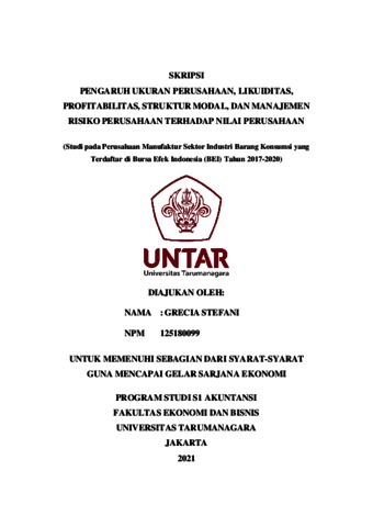 STEFANI, GRECIA (2021) PENGARUH UKURAN PERUSAHAAN, LIKUIDITAS, PROFITABILITAS, STRUKTUR MODAL, DAN MANAJEMEN RISIKO PERUSAHAAN TERHADAP NILAI PERUSAHAAN. Skripsi thesis, Universitas Tarumanagara.