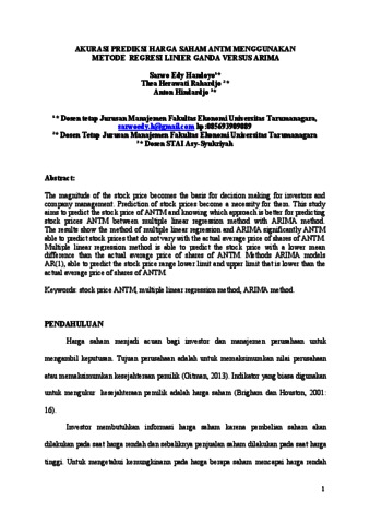 Handoyo, Sarwo Edy and Rahardjo, Thea Herawati and Hindardjo, Anton (2014) AKURASI PREDIKSI HARGA SAHAM ANTM MENGGUNAKAN METODE REGRESI LINIER GANDA VERSUS ARIMA. Karya Ilmiah Dosen. pp. 1-14.