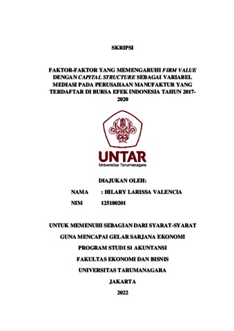 VALENCIA, HILARY LARISSA (2021) FAKTOR-FAKTOR YANG MEMENGARUHI FIRM VALUE DENGAN CAPITAL STRUCTURE SEBAGAI VARIABEL MEDIASI PADA PERUSAHAAN MANUFAKTUR YANG TERDAFTAR DI BURSA EFEK INDONESIA TAHUN 2017-2020. Skripsi thesis, Universitas Tarumanagara.