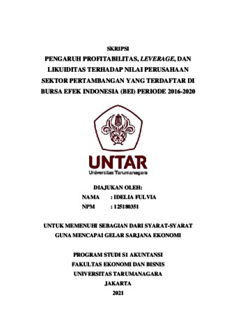 FULVIA, IDELIA (2021) PENGARUH PROFITABILITAS, LEVERAGE, DAN LIKUIDITAS TERHADAP NILAI PERUSAHAAN SEKTOR PERTAMBANGAN YANG TERDAFTAR DI BURSA EFEK INDONESIA (BEI) PERIODE 2016-2020. Skripsi thesis, Universitas Tarumanagara.