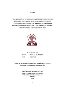 FRANSISKA, IMELDA (2021) PENGARUH RETURN ON ASET (ROA), DEBT TO EQUITY RATIO (DER), ECONOMIC VALUE ADDED (EVA), TOTAL ASSETS TURNOVER (TATO), DAN CURRENT RATIO (CR) TERHADAP RETURN SAHAM PADA PERUSAHAAN MANUFAKTUR YANG TERDAFTAR DI BURSA EFEK INDONESIA PADA TAHUN 2017 – 2019. Skripsi thesis, Universitas Tarumanagara.