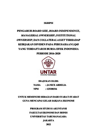 ARDELIA, JANICE (2021) PENGARUH BOARD SIZE, BOARD INDEPENDENCE, MANAGERIAL OWNERSHIP, INSTITUTIONAL OWNERSHIP, DAN COLLATERAL ASSET TERHADAP KEBIJAKAN DIVIDEN PADA PERUSAHAAN LQ45 YANG TERDAFTAR DI BURSA EFEK INDONESIA PERIODE 2016-2020. Skripsi thesis, Universitas Tarumanagara.
