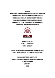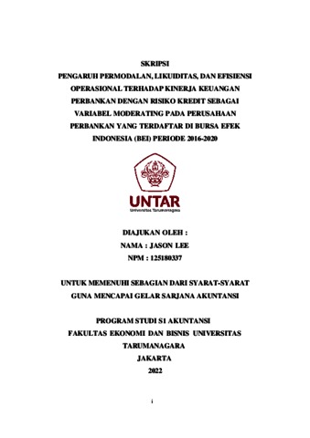 LEE, JASON (2021) PENGARUH PERMODALAN, LIKUIDITAS, DAN EFISIENSI OPERASIONAL TERHADAP KINERJA KEUANGAN PERBANKAN DENGAN RISIKO KREDIT SEBAGAI VARIABEL MODERATING PADA PERUSAHAAN PERBANKAN YANG TERDAFTAR DI BURSA EFEK INDONESIA (BEI) PERIODE 2016-2020. Skripsi thesis, Universitas Tarumanagara.