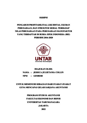 COLLIN, JESSICA JULIETANIA (2021) PENGARUH PROFITABILITAS, LIKUIDITAS, UKURAN PERUSAHAAN, DAN STRUKTUR MODAL TERHADAP NILAI PERUSAHAAN PADA PERUSAHAAN MANUFAKTUR YANG TERDAFTAR DI BURSA EFEK INDONESIA (BEI) PERIODE 2016-2020. Skripsi thesis, Universitas Tarumanagara.