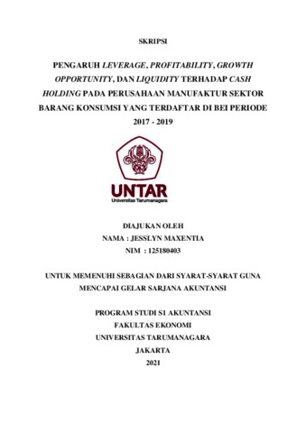 MAXENTIA, JESSLYN (2021) PENGARUH LEVERAGE, PROFITABILITY, GROWTH OPPORTUNITY, DAN LIQUIDITY TERHADAP CASH HOLDING PADA PERUSAHAAN MANUFAKTUR SEKTOR BARANG KONSUMSI YANG TERDAFTAR DI BEI PERIODE 2017 – 2019. Skripsi thesis, Universitas Tarumanagara.