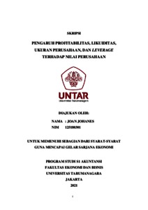 JOHANES, JOAN (2021) PENGARUH PROFITABILITAS, LIKUIDITAS, UKURAN PERUSAHAAN, DAN LEVERAGE TERHADAP NILAI PERUSAHAAN. Skripsi thesis, Universitas Tarumanagara.