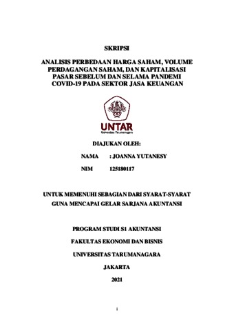 YUTANESY, JOANNA (2021) ANALISIS PERBEDAAN HARGA SAHAM, VOLUME PERDAGANGAN SAHAM, DAN KAPITALISASI PASAR SEBELUM DAN SELAMA PANDEMI COVID-19 PADA SEKTOR JASA KEUANGAN. Skripsi thesis, Universitas Tarumanagara.