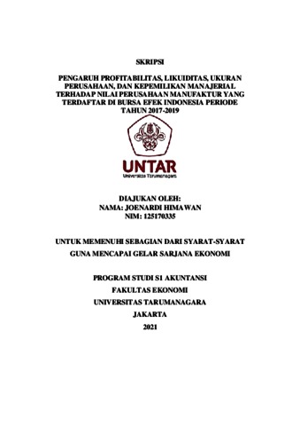 HIMAWAN, JOENARDI (2021) PENGARUH PROFITABILITAS, LIKUIDITAS, UKURAN PERUSAHAAN, DAN KEPEMILIKAN MANAJERIAL TERHADAP NILAI PERUSAHAAN MANUFAKTUR YANG TERDAFTAR DI BURSA EFEK INDONESIA PERIODE TAHUN 2017-2019. Skripsi thesis, Universitas Tarumanagara.