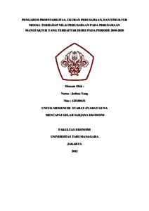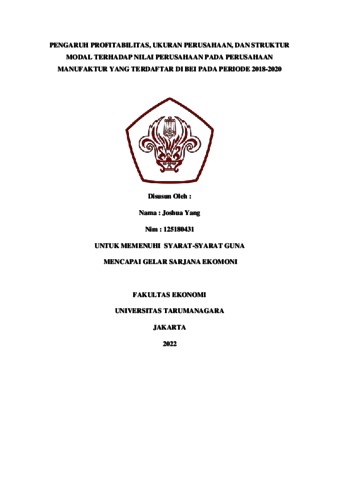 Yang, Joshua (2021) PENGARUH PROFITABILITAS, UKURAN PERUSAHAAN, DAN STRUKTUR MODAL TERHADAP NILAI PERUSAHAAN PADA PERUSAHAAN MANUFAKTUR YANG TERDAFTAR DI BEI PADA PERIODE 2018-2020. Skripsi thesis, Universitas Tarumanagara.