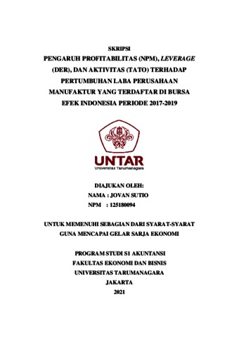 SUTIO, JOVAN (2021) PENGARUH PROFITABILITAS (NPM), LEVERAGE (DER), DAN AKTIVITAS (TATO) TERHADAP PERTUMBUHAN LABA PERUSAHAAN MANUFAKTUR YANG TERDAFTAR DI BURSA EFEK INDONESIA PERIODE 2017-2019. Skripsi thesis, Universitas Tarumanagara.