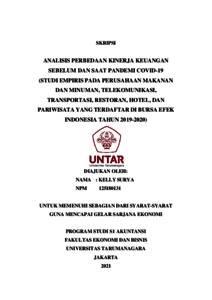SURYA, KELLY (2021) ANALISIS PERBEDAAN KINERJA KEUANGAN SEBELUM DAN SAAT PANDEMI COVID-19 (STUDI EMPIRIS PADA PERUSAHAAN MAKANAN DAN MINUMAN, TELEKOMUNIKASI, TRANSPORTASI, RESTORAN, HOTEL, DAN PARIWISATA YANG TERDAFTAR DI BURSA EFEK INDONESIA TAHUN 2019-2020). Skripsi thesis, Universitas Tarumanagara.