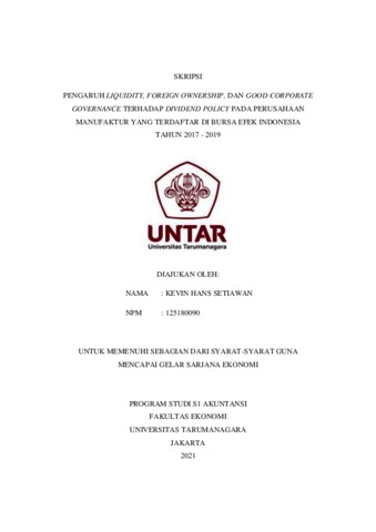 SETIAWAN, KEVIN HANS (2021) PENGARUH LIQUIDITY, FOREIGN OWNERSHIP, DAN GOOD CORPORATE GOVERNANCE TERHADAP DIVIDEND POLICY PADA PERUSAHAAN MANUFAKTUR YANG TERDAFTAR DI BURSA EFEK INDONESIA TAHUN 2017 – 2019. Skripsi thesis, Universitas Tarumanagara.