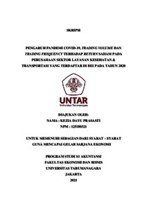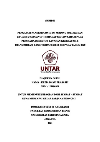 PRASASTI, KEZIA DAYU (2021) PENGARUH PANDEMI COVID-19, TRADING VOLUME DAN TRADING FREQUENCY TERHADAP RETURN SAHAM PADA PERUSAHAAN SEKTOR LAYANAN KESEHATAN & TRANSPORTASI YANG TERDAFTAR DI BEI PADA TAHUN 2020. Skripsi thesis, Universitas Tarumanagara.