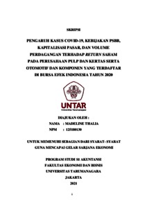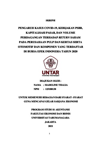 THALIA, MADELINE (2021) PENGARUH KASUS COVID-19, KEBIJAKAN PSBB, KAPITALISASI PASAR, DAN VOLUME PERDAGANGAN TERHADAP RETURN SAHAM PADA PERUSAHAAN PULP DAN KERTAS SERTA OTOMOTIF DAN KOMPONEN YANG TERDAFTAR DI BURSA EFEK INDONESIA TAHUN 2020. Skripsi thesis, Universitas Tarumanagara.
