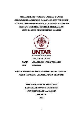 WIJANTO, MADELINE VANIA (2021) PENGARUH NET WORKING CAPITAL, CAPITAL EXPENDITURE, LEVERAGE, DAN BOARD SIZE TERHADAP CASH HOLDINGS DENGAN FIRM SIZE DAN PROFITABILITY SEBAGAI VARIABEL KONTROL PERUSAHAAN MANUFAKTUR DI BEI PERIODE 2016-2019. Skripsi thesis, Universitas Tarumanagara.